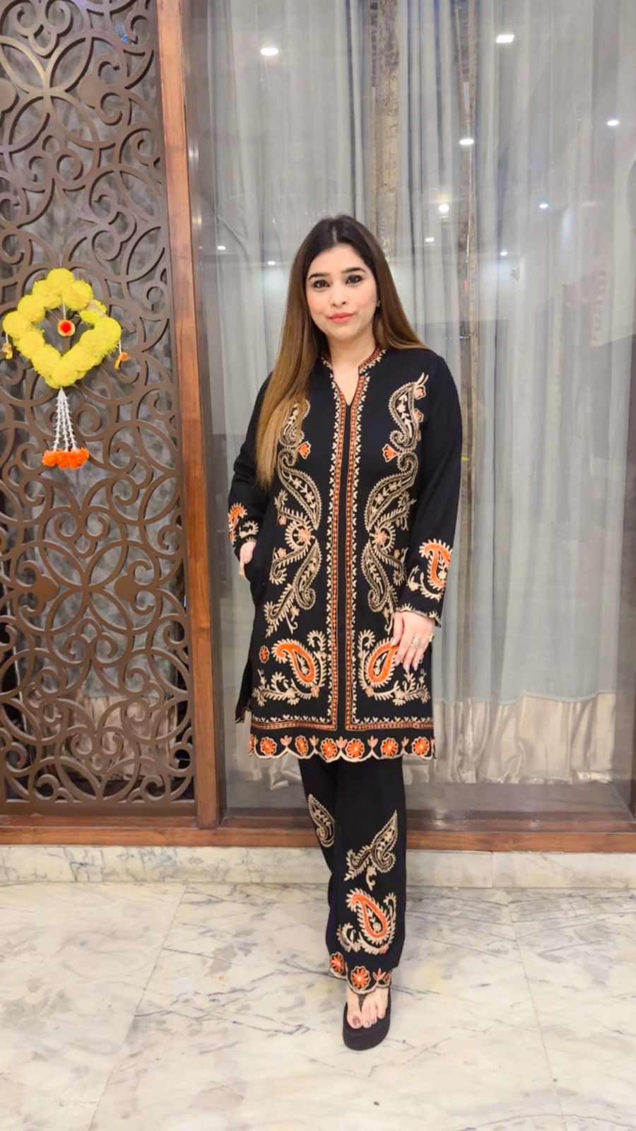 Make a bold ethnic statement with this elegant Black Embroidered Kurti Pant Set. Designed with rich paisley and floral embroidery in contrasting tones, this outfit blends traditional craftsmanship with modern style. Perfect for festive wear, evening gatherings, and special occasions.